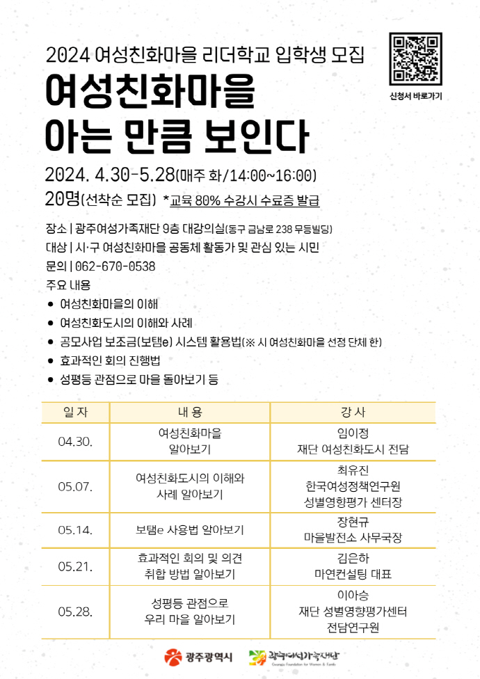 광주여성가족재단은 30일부터 5월 28일까지 매주 화요일 총 5차례에 걸쳐 ‘2024 여성친화마을 리더학교’를 운영한다고 28일 밝혔다.