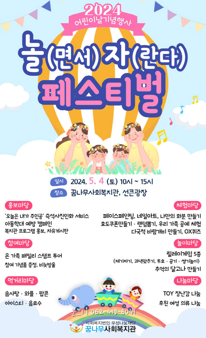 광주 북구 우산동 사회복지법인 우성나눔재단 꿈나무사회복지관은 어린이날을 맞아 4일 ‘놀(면서) 자(란다) 페스티벌’을 개최한다고 3일 밝혔다.